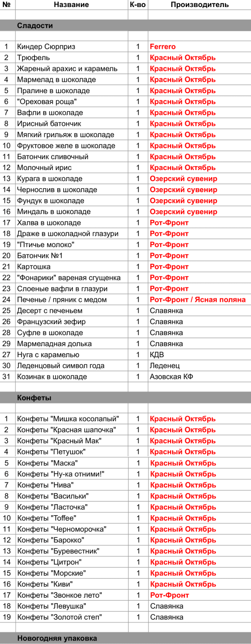 Халва в шоколаде (1 шт), Драже в шоколадной глазури (1 шт), "Птичье молоко" (1 шт), Батончик №1 (1 шт), Картошка (1 шт), "Фонарики" вареная сгущенка (1 шт), Слоеные вафли в глазури (1 шт), Печенье / пряник с медом (1 шт), Конфеты "Звонкое лето" (1 шт)